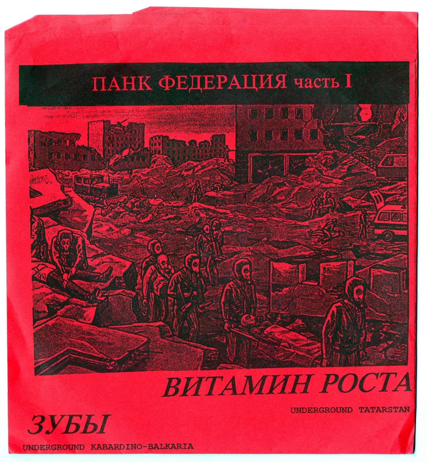 "Зубы (2) / Витамин Роста – Панк Федерация Часть 1 (Underground Kabardino-Balkaria And Tatarstan) : Two bands from different republics of the Russian Federation: ZUBY gives us 3 songs of hardcore thrash and MOTORHEAD-oid speedmetal from Nalchik in Kabardino-Balkaria, and VITAMIN ROSTA comes out with 4 songs of energetic folk-pop-punk from Tatarstan.-Ç Released in Oct. 2001, this is a numbered, heavyweight gray vinyl pressing of 500 copies, packed in a fold-out sleeve with liner notes, lyrics and photos. -Tian An Men 89