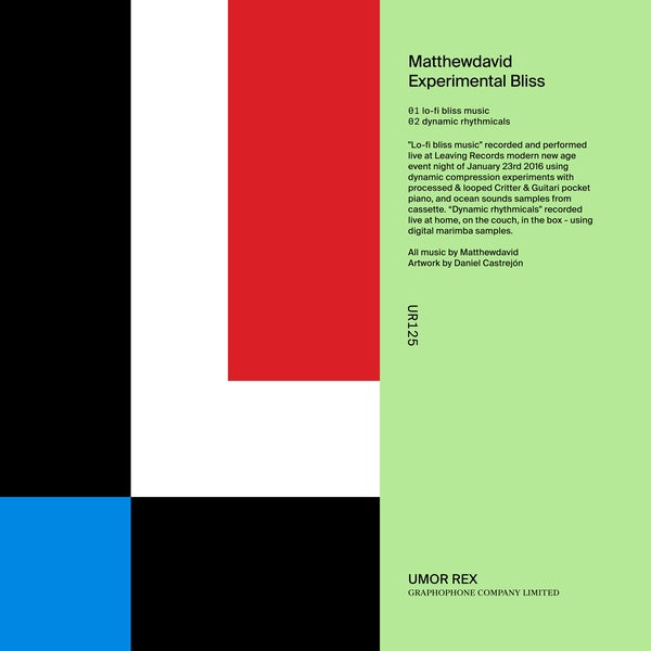 "Matthewdavid is a co-founder of the Los Angeles label Leaving Records, and a collaborator of Flying Lotus, Sun Araw, Julia Holter, Laraaji, Odd Nosdam, among others. Experimental Bliss is his first album on Umor Rex, two long pieces devoted to the bliss of experimental music creation. This is unconventional music, aiming to assist the listener in attaining a state of bliss or relaxation. It incorporates obvious artifacts of compressed noise and texture with harmonic tonal elements. The creative process is always evolving and changing, often relying on digital music software and hardware technology to process and re-sample collected "organic" sounds from analog or environmental sources. Side A, "Lo-Fi Bliss Music", was recorded and performed live at the Leaving Records modern new age night event, using dynamic compression experiments with a processed and looped Critter & Guitari pocket piano, and ocean sounds samples from a cassette. "Dynamic Rhythmicals" was recorded live at home, using digital marimba samples. Includes download code; edition of 100." - Umor Rex .