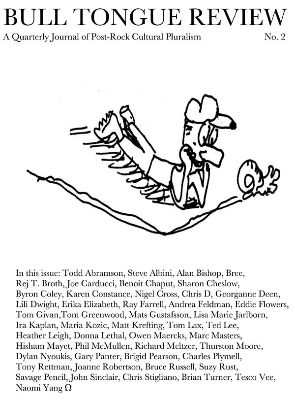 "A Quarterly Journal of Post-Rock Cultural Pluralism. In this issue: Todd Abramson, Steve Albini, Alan Bishop, Bree, Rej T. Broth, Joe Carducci, Benoit Chaput, Sharon Cheslow, Byron Coley, Karen Constance, Nigel Cross, Chris D, Georganne Deen, Lili Dwight, Erika Elizabeth, Ray Farrell, Andrea Feldman, Eddie Flowers, Tom Givan, Tom Greenwood, Mats Gustafsson, Lisa Marie Jarlborn, Ira Kaplan, Maria Kozic, Matt Krefting, Tom Lax, Ted Lee, Heather Leigh, Donna Lethal, Owen Maercks, Marc Masters, Hisham Mayet, Phil McMullen, Richard Meltzer, Thurston Moore, Dylan Nyoukis, Gary Panter, Brigid Pearson, Charles Plymell, Tony Rettman, Joanne Robertson, Bruce Russell, Suzy Rust, Savage Pencil, John Sinclair, Chris Stigliano, Brian Turner, Tesco Vee, Naomi Yang. 80 pages, black & white 8.5 x 11"." - Bull Tongue.