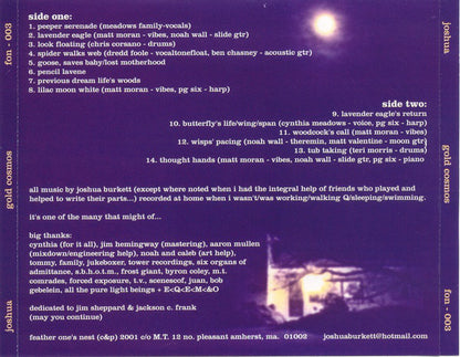 "This is the third album recorded by Joshua Burkett. The first, Owl Leaves Rustling, was returned to life by Spirit of Orr. Its CDR follow-up, Life Less Lost, was recently retrieved by Golden Lab. Now it is time for Gold Cosmos to once again bask in the sun. Initially released in 2001, Gold Cosmos (a title I always thought sounded like a Robbie Basho bootleg) featured performances by people like Dredd Foole, Matt Valentine, Ben Chasny, Teri Morris, PG Six, Chris Corsano, and Noah Wall, which was the worlds first real evidence that Burkett was not operating entirely in a vacuum. Prior to this Joshuas work seemed quite hermetic, although those few who knew of his recorded legacy would tell you otherwise. The album still sounds amazing and revelatory today. The music proudly wears the fingerprints of a vast array of outsider artists from around the globe who created their own weird universes in the guise of folk music -- from Dave Bixby to Dana Westover, Perry Leopold, Ed Askew (with whom he collaborated), and various other freaks. These impulses were run through deep knowledge of UK acid folk (ISB, COB, and onward) and you end up with a brilliant and unique alloy. This is the kind of deep knowledge you only acquire by haunting record stores for a long time, but Burkett never falls prey to checklist-thinking or doing the obvious. His creations are fully his own and they wail in the softest way imaginable. Prepare for a real trip." - Byron Coley, 2015. Limited edition of 500.