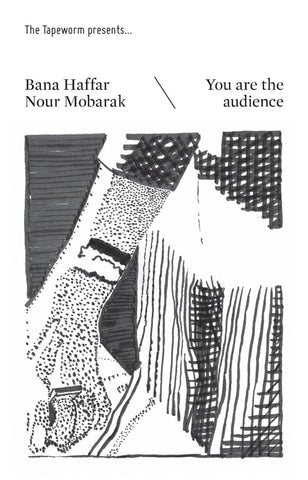 "This cassette tape is a document of two live performances by the Bana Haffar/Nour Mobarak duo. Their mutual pleasure in variable tunings, granular synthesis, and structured improvisations shaped their collaboration. A lifelong expatriate, Bana Haffar was born in Saudi Arabia in 1987 and spent much of her childhood in the GCC. Through her switch from ten years of electric bass to modular synthesizers in 2014, Bana is attempting to dismantle years of institutional "conditioning" in traditional systems of music theory and performance. She is interested in exploring sonic disintegration and coalescence into new forms and synthesized experiences. Nour Mobarak (Lebanese-American, born 1985 in Cairo, Egypt) is an artist working with writing, music, performance, sculpture, and film making. Performances include the Hammer Museum, Los Angeles; Miguel Abreu Gallery, New York; Museum of Contemporary Art, San Diego; Stadslimeit, Antwerp; Cafe OTO, London, and Cambridge University, Cambridge; among others. Mobarak has participated in exhibitions at Miguel Abreu Gallery, Cubitt Gallery, Rodeo, Taaffe Place, LAXART. Her writings have been published by De Appel/F.R. David, The Claudius App, and The Salzburg Review among others. Her music has been released by Ultra Eczema (Antwerp) and Recital (Los Angeles)." - The Tapeworm .