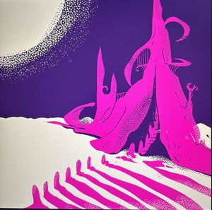 "Limited to 100 LPs. Art by Ira Marcks . Silkscreened by Alan Sherry At SIWA prints. " Human Hair is the duo of Pat Murano and Richard Hoffman , both long running fixtures of the NYC scene, Richard with Sightings , Insayngel , and his recent solo project Organs Obsolete ; and Pat with NNCK , Malkuth and his solo alter ego Decimus . Pat was also an auxiliary member of Sightings (one of the best bands to ever come out of NYC!) in the later years of the band and is in a duo with Sightings guitarist Mark Morgan called Key of Shame . Human Hair is another lovely and mutant outgrowth from this shared history. It has all the serpentine and liquid pace you would expect but with a new kind of melancholy I haven't heard in the previously mentioned projects. It's great to hear Richard in such stark relief, his taut and coiled punctuations keeping a kind of slithering sense of time while Pat unfurls vistas that don't exactly spread out as they kind of infinitely zoom in on themselves circling back around and magnifying every little snatch of texture. There's a loose almost psych vibe that, right when you think is gonna settle into a side longer, takes a right-hand turn into some kind of Richard Pinhas on jawharp section that spreads out to the horizon. Side B is (I kind of hate when music writers just mention mash ups of references but I'm not a music writer and when I wrote this in my notes while listening it made too much sense to me to not include. Also I was told that 'anything will suffice'!) P.I.L. playing Ry Cooders Paris Texas soundtrack and I think stands as one of the kind of most 'stranded on an alien planet of nothing' these guys have done. The desolation of space and subsequent tension is accumulative not palpable. It rises with time, slowly, because of all the patience and exploration that Pat and Richard allow for. The lifeline has slipped out of yr hands before you even realize that you're floating in open space. Daksina has really been putting out some amazing records of improvised music that don't sound like what has become the GENRE of improvised music sounds like. It's really personally reinvigorated a lot of my love of improvised music and this Human Hair LP really sits at the top of that." -- Bill Nace , 2025"