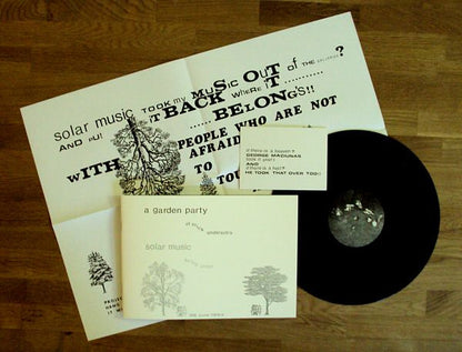 On June 26, 1983, Joe Jones set up a solar orchestra in Erik Anderschs garden in D_ɬºsseldorf, North Rhine-Westphalia, Germany. Guests were invited for a dinner party to listen to the orchestra. The music was recorded and the event documented by various photographs that were published as a book by Jones in 1987 in an edition of 15 copies. The audio recording remained unreleased. This edition, titled A Garden Party, brings together the recording and an A4-sized reproduction of Joness book. It is presented in a gatefold PVC sleeve; Right-hand side holds the LP, left-hand side holds the book, a poster, and a postcard; Edition of 200. - Edition Telemark.