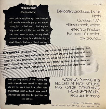 Before power pop was really a thing, Knickers were Anglofied dandies, playing melodic songs with rudimentary fuzz power: loud-fast versions of songs like “I Think We’re Alone Now,” the Small Faces' “Sha La La Lee” and the Hollies' “Look Through Any Window.” In March 1979, long after the band ceased to exist, this single of two Gallow/Robbins originals was released on the first Reckless Records (the Chicago and London shops of that name came later)."