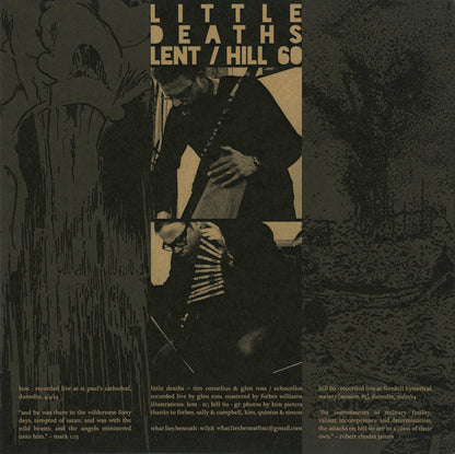 Little Deaths = Tim Cornelius & Glen Ross / echocellos. Recorded live by Glen Ross. Mastered by Forbes Williams. Illustrations: Lent - TC; Hill 60 - GR. Photos by Kim Pieters. Thanks to Forbes, Sally & Campbell, Kim, Quintus & Simon." - What Lies Beneath.