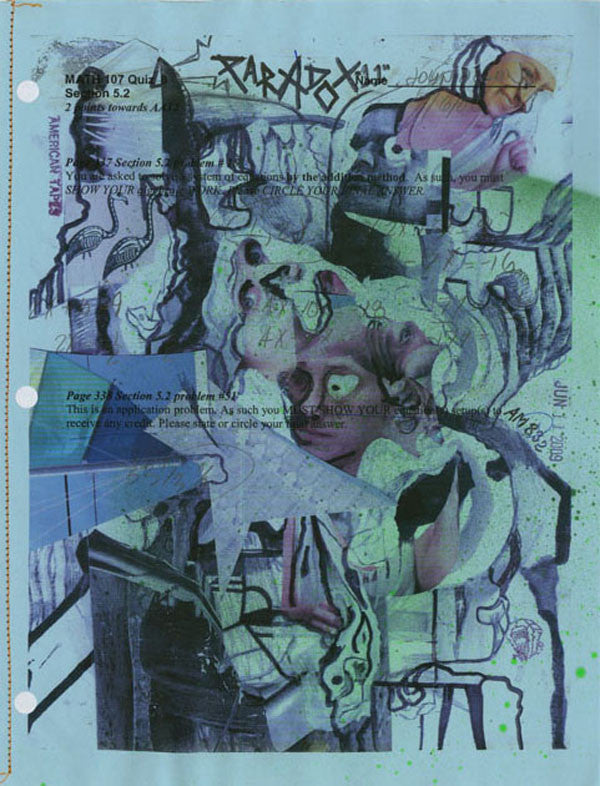 "The 2-D inzanity continues!! Second double digit eyeball voodoo edition!! Ten pages of whatthe? Collage and sketch in total inzane style. Scribble-sprawl automatic visual OD, if a face dont look good, morph-that-mug stylings. Find your path through the cut and paste upside down universe!! Color covers, b & w gutz, hand sewn binding, with cd soundtrack to seal the experience. Numbered edition of 40." - American Tapes
