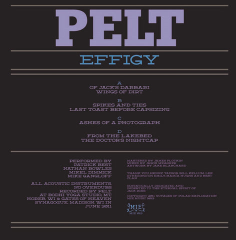 "Recorded live in 2011 in Wisconsin (at an old yoga studio and at a decommissioned synagogue), Effigy melts layer upon layer of droning strings over never-ending harmoniums while peals of gongs ring out to mesmerizing effect-a testament to the ancient animal-shaped effigy mounds which dot the landscape in and around Madison, Wisconsin. Edition of 500." - MIE.