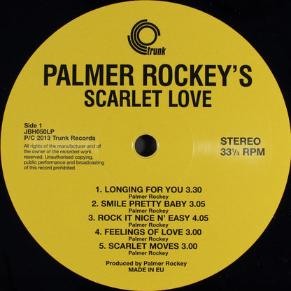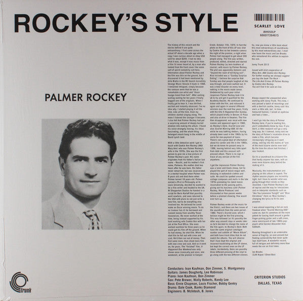 "One of the rarest, weirdest and most brilliantly odd soundtracks of all time, written and performed by one of the most fascinating underground characters ever. Described by Jello Biafra as a disco lounge lizard from hell," Palmer Rockey and the Palmer Rockey story have to be read to be believed, and even then, you might not believe it. And this album has to be heard properly to understand the madness, weirdness and total passion brought to the studio sometime in Texas in the mid- to late 1970s. Palmer Rockey was a remarkable con-artist. He made this one record, the soundtrack to his one weird movie. Its incredibly rare, only one copy surfacing in the last decade. Once heard, you may fall deeply for Palmers charms, its strangely moving and all wrong, like something straight out of the world of David Lynch. The edited Palmer Rockey story goes something like this: after a difficult childhood but an interesting education, Palmer Rockey became obsessed by the movies. So obsessed, that he travelled to the UK and tried to get a film script to Boris Karloff in Shepperton. Unsuccessful, he returned to Texas to make his own film. To do so (according to legend) he conned rich Texan housewives out of money. When he got money, he shot film, then fell out with the cast and crew. He then conned more money from different women, shot more film with different cast and crew, then fell out with them, too. This continued for years. The "finished" film, It Happened One Weekend was only shown once (ironically just once, one weekend), at the premier in Canyon Creek, Sunday October 11th, 1974. In fact, the photo on the front of the album was shot by his wife the night of the premier. The film was written, produced, edited, directed, and starred Palmer Rockey (as twin brothers of course), with all music by Palmer Rockey. The plot was apparently demonic and "beyond the room of terrifying evil." Also included was a "Sunday Surprise Ending." I believe the surprise that Sunday was that people laughed all the way through, and even walked out. It was a total disaster on every level, apparently nothing in the movie made any sense at all. But undeterred by such poor reaction, he continued to tinker with the film -- sure that it would eventually bring him an Academy Award. He released it again and again in several different versions over the next few years, firstly with the title It Happened One Sunday, which played briefly in Denver, El Paso, and also at drive-in theaters. The film then disappeared, was recut with new scenes and appeared again in 1980, as Rockeys Style, Scarlet Love, and also Scarlet Warning 666. All the while Palmer Rockey was battling debtors, having already been sued in the 1960s by his uncle for non-payment of loans. Theres not a great deal of information about his career and life in the 1980s, but we do know he passed away in 1996, leaving behind very little apart from debt and this unusual self-pressed album. There is no sign or trace of any version of the film anywhere. And boy, are people looking for it. Palmer wrote all the music for the film(s), and there are, as far as we know, two private issues of the soundtrack from the same period -- 1980. Theres Scarlet Love, which was followed (or its possibly the other way around) days or weeks later as hed decided to change the name of the film again, to Rockeys Style. Both have the same original catalog number and subtitle of "Movie Album," and both have track titles that do not match the albums. You will observe Trunk has kept the original and incorrect tracklisting on the album sleeve, but kept the correct ones on the album labels. Musically its beautifully played and oddly performed, with a bizarre sense of passion and surprising honesty. Its an unusual album in that once heard, it sticks like glue to your brain. You may well find yourself getting slightly obsessed by it. We certainly have. Sleeve notes include an intro by Jon Brooks of Ghostbox, who not only remastered the album but also quickly became consumed by the music and the Palmer Rockey story. And now this incredible and unique outsider album is released, one has to wonder if anyone will ever find the missing Palmer Rockey movie." -Trunk.