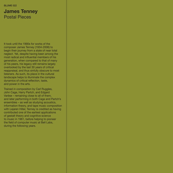 "Since its founding back in 2014, Blume has carved a unique place in cultural landscape, issuing free-standing works, spanning the historical and contemporary, that represent singular gestures of creativity within the field of experimental sound. Joining their broad efforts in building networks of context and understanding, Blume returns with the first ever vinyl release to attend to James Tenney's legendary Postal Pieces. This marks the first ever appearance of five of the suite's works -- "Maximusic, for Max Neuhaus" (1965), "Having Never Written a Note for Percussion, for John Bergamo" (1971), "FFor Percussion Perhaps, or... [Night], for Harold Budd" (1971), "Cellogram, for Joel Krosnick" (1971), and "Beast, for Buell Neidlinger" (1971) -- on vinyl, drawing upon recordings made in 2003, by the Amsterdam based ensemble, The Barton Workshop, under the direction of James Fulkerson. Among the most important and highly regarded efforts in Tenney's canon of compositions, as well as within the history of 20th Century music, these five pieces represent a crucial bridge between Fluxus-oriented conceptualism, minimalism, and the microtonal complexities that would emerge in their wakes. A student of composition under Carl Ruggles, John Cage, Harry Partch, and Edgard Varèse, as well as acoustics, information theory, and tape music composition under Lejaren Hiller, James Tenney carved a wide path within the contexts of experimental and avant-garde music during the second half of the 20th Century. A suite of eleven compositions, The Postal Pieces, stands among Tenney's well known and celebrated compositions, and illuminates the dualities embraced by the composer, notably his use of sound to develop consciousness in and of others, and his willingness to draw on elements and observations of everyday life; citing his strong dislike of writing letters as being the primary inspiration for their inception. The suite is composed around three themes: Tenney's concept of swell form (utilizing repetition and progressing through a structurally symmetrical arch), intonation, and the desire to produce "meditative perceptual states." A hugely important addition to Blume's ever-expanding efforts in context building and networks of creative practice, James Tenney's Post Pieces is issued in a highly limited vinyl edition of 300 copies, which includes an exact replica of the original postcard graphic scores, and features newly commissioned liner notes by Bradford Bailey."