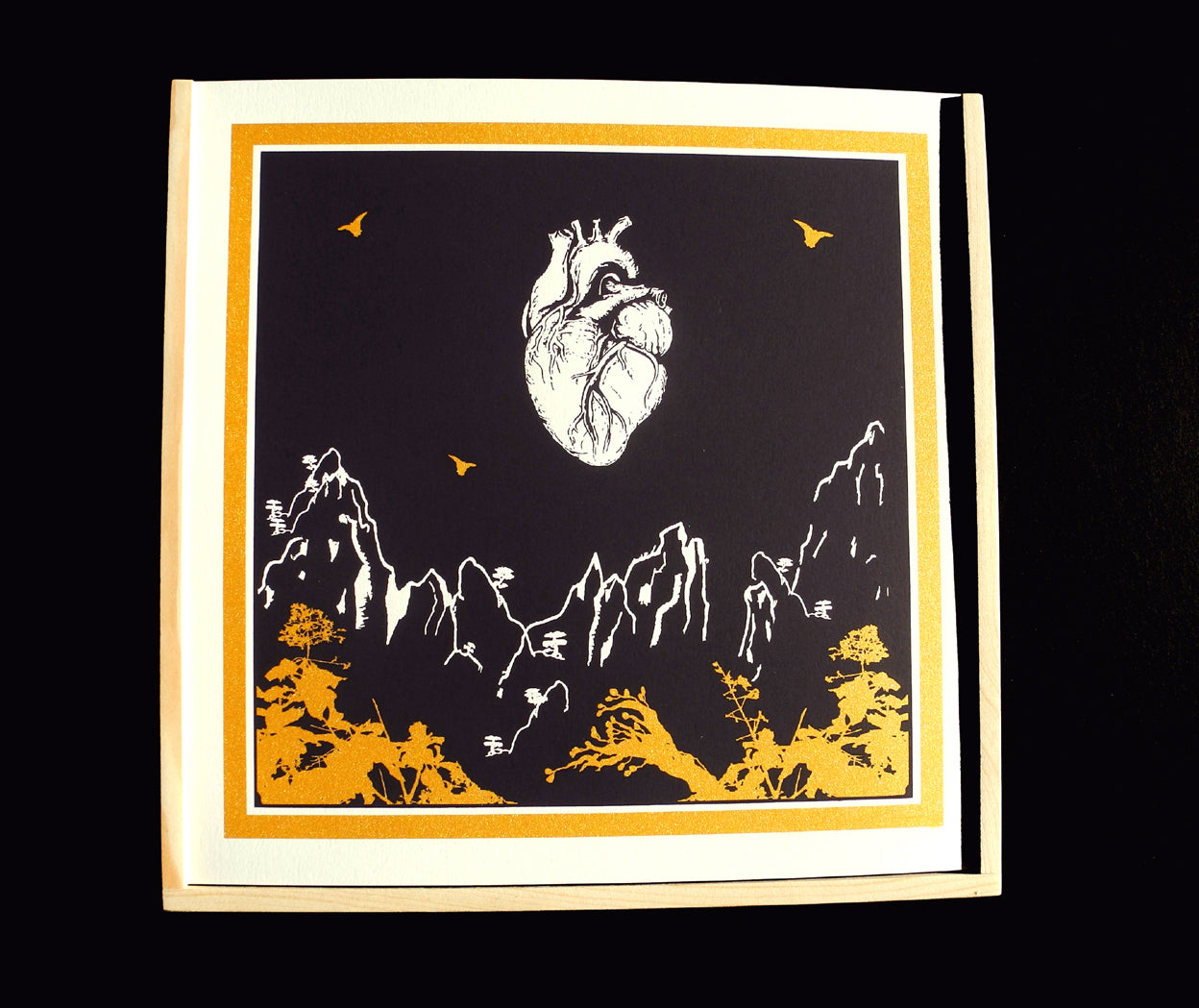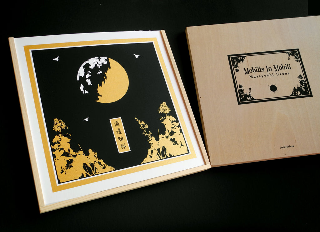 Edition of 285, silk-screened wooden slipcase with 3 silkscreened panels (black & gold) + inserts and a 6 postcards set. Handmade slipcases and printing job by Alan Sherry. Liner notes by Michel Henritzi.