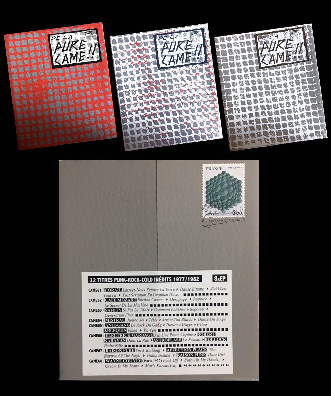Gray version, limited to 221 copies. "A box set for 32 unreleased tracks, never released anywhere, the Chameleon did it. With the help of many Camis (contributors of the Cameleon label), here are some nuggets of French rock that had fallen into oblivion. The first 4 groups with their respective EPs were already on the Thesaurus Volume 2 compilation , CORAIL, CAFE MOZART, SAFETY and MISTRAL. It is thanks to the contacts made for this compilation that several unreleased appeared, and enough to release an EP for each. As for the other groups also present ELECTRICK GARBAGE , ROBERT KARAYAN & ARLEQUIN, they are in good company with ANTI-GANG , BOLLOCK , ASTROFLASH , PLACE AFFECTION and PURE REASON . The icing on the cake is a live EP in Paris in 1977 of WAYNE COUNTY during the first Punk Night in March 1977. The first 4 EP are also for retail sale (200 copies), but not the others, only available in this box made by hand in 300 copies. The red box (54 copies) is intended for artists and groups related to the project, red and gray (25 copies) to Cameleon's regular customers. There are 221 gray boxes for everyone. All the boxes are numbered from 1 to 300." - Cameleon.