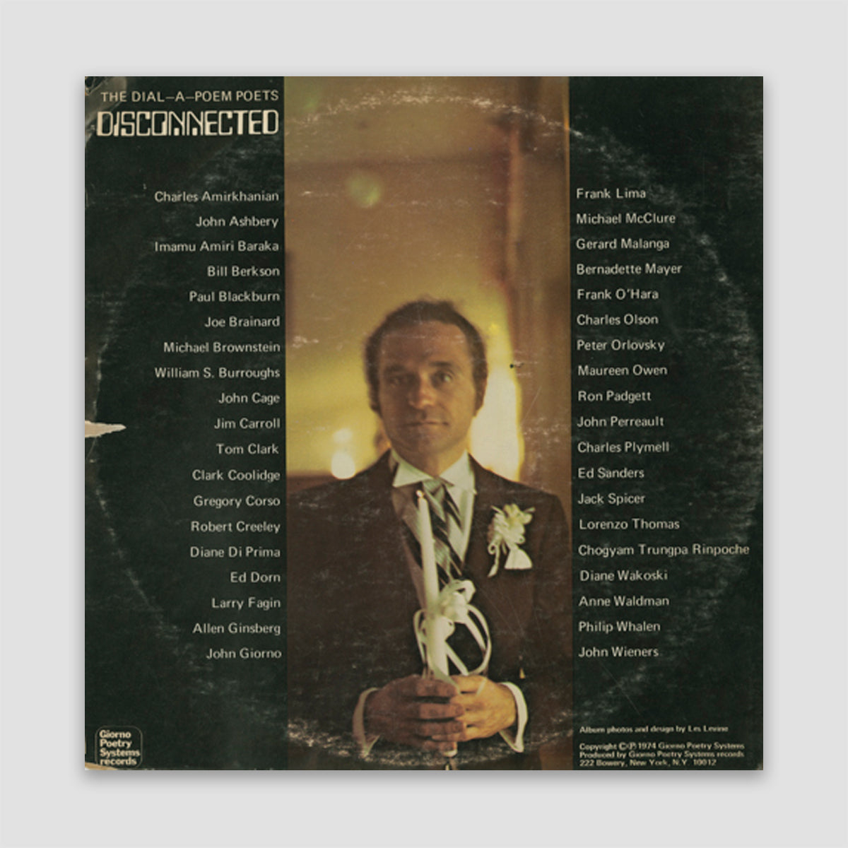 The earliest releases were exclusively poetry collections of the "Dial-A-Poets" (John Giorno, William S Burroughs, Brion Gysin, Allen Ginsberg, John Cage etc.): "In 1961 I was a young poet who hung out with young artists like Andy Warhol, Bob Rauschenberg and Jasper Johns, as well as with members of the Judson Dance Theatre. The use of modern mass media and technologies by these artists made me realize that poetry was 75 years behind painting and sculpture, dance and music. And I thought, if they can do it, why can't I do it for poetry. Why not try to connect with an audience using all the entertainments of ordinary life: television, the telephone, record albums, etc? It was the poet's job to invent new venues and make fresh contact with the audience. This inspiration gave rise to Giorno Poetry Systems" - Giorno Poetry Systems