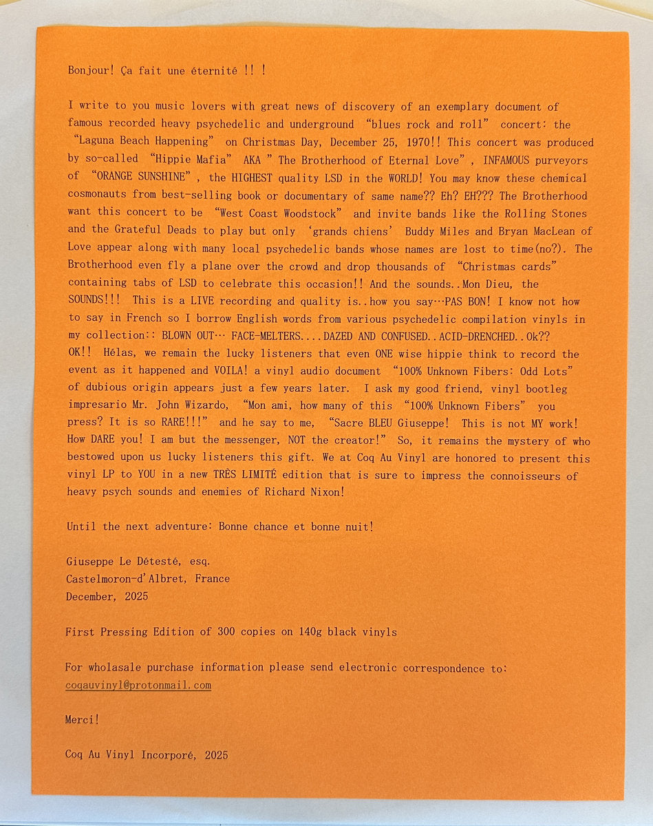 From the mYsTeRiOuS "Coq Au Vinyl" label out of France, the same folks you brought you the Gee Gee Decorator and Pat Metheny's "Zero Tolerance For Silence" LP reissue.. This LP is a live document of the Laguna Beach Happening from December 25, 1970.. a concert billed as a "West Coast Woodstock" and created by the Brotherhood of Eternal Love AKA the "Hippie Mafia".. Best known as the international LSD trafficking ring who rubbed shoulders with Timothy Leary, Jimi Hendrix and (rumor has it) members of the Manson Family. These are the guys who brought the world "Orange Sunshine" acid (check the book and documentary of the same name!) The sounds on this record were previously released on an obscenely rare 70's bootleg called "100% Unknown Fibers: Odd Lots" that appeared a few years after the concert in 1970. Most of the bands on here are psych/blues rock/acid folk unknowns but apparently Buddy Miles and Bryan MacLean of Love are on this thing? Regardless: crazy audience recording of (at least parts of) the fest with several amazing tunes and plenty of between band banter and rants from local burnouts, festival "security" and even a Black Panther or two. Yes, that is an actual piece of blotter paper on the front cover. Totally weird record. Exactly what I'd expect from Coq Au Vinyl. 300 pressed, hand stamped on the back cover."